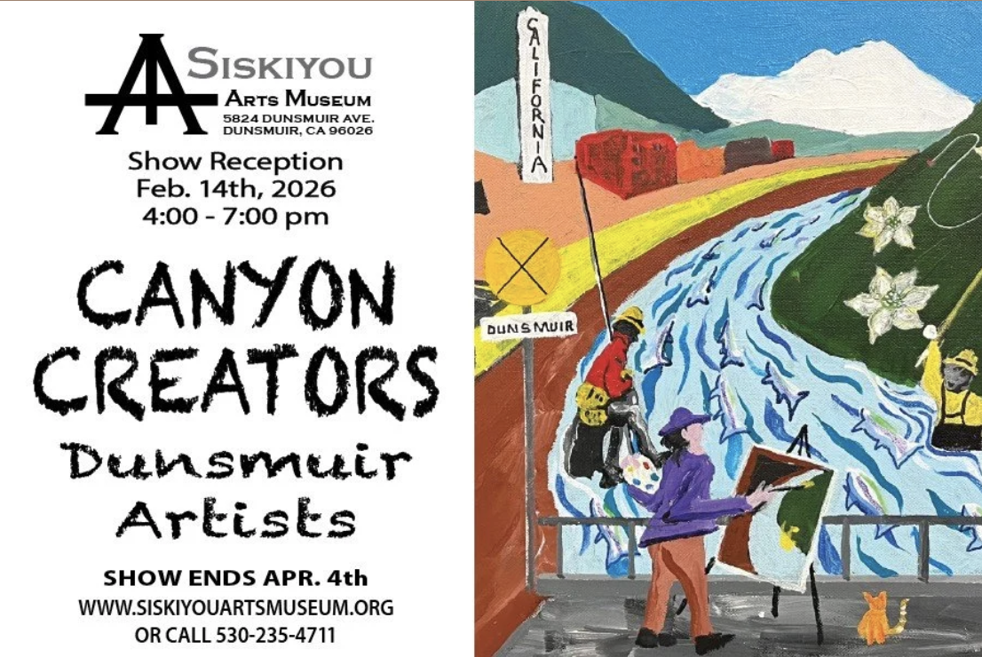 Siskiyou Arts Museum: Canyon Creators: Dunsmuir Artists, reception with wine & nibbles 4-7pm.