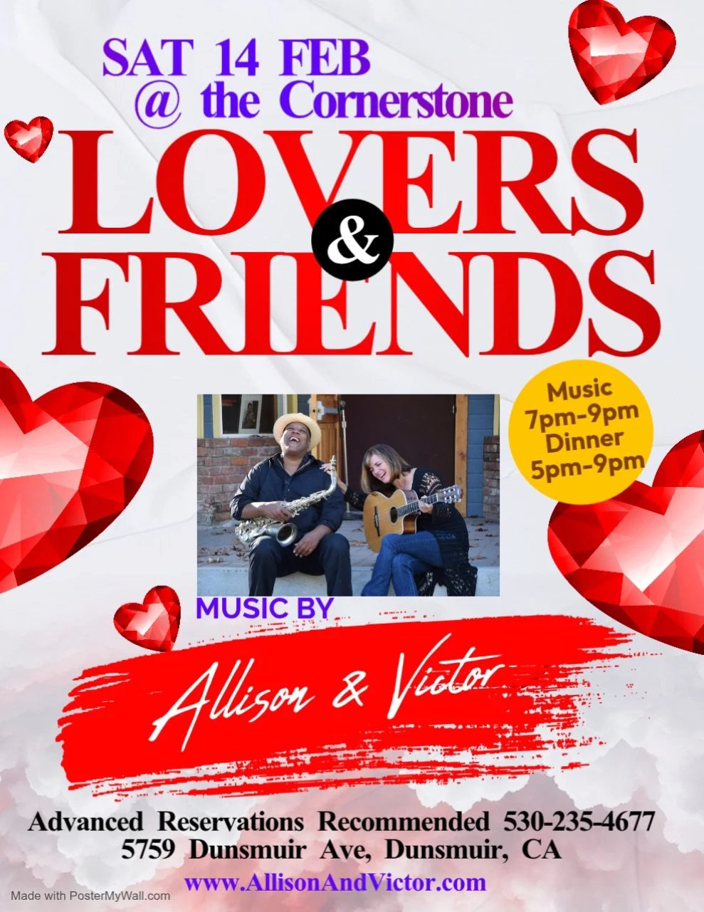 Cornerstone Café: “Lovers & Friends” dinner 5-9pm & live music with Alison & Victor 7-9pm, breakfast, lunch, baked goods, coffee & tea, 8am-2pm.