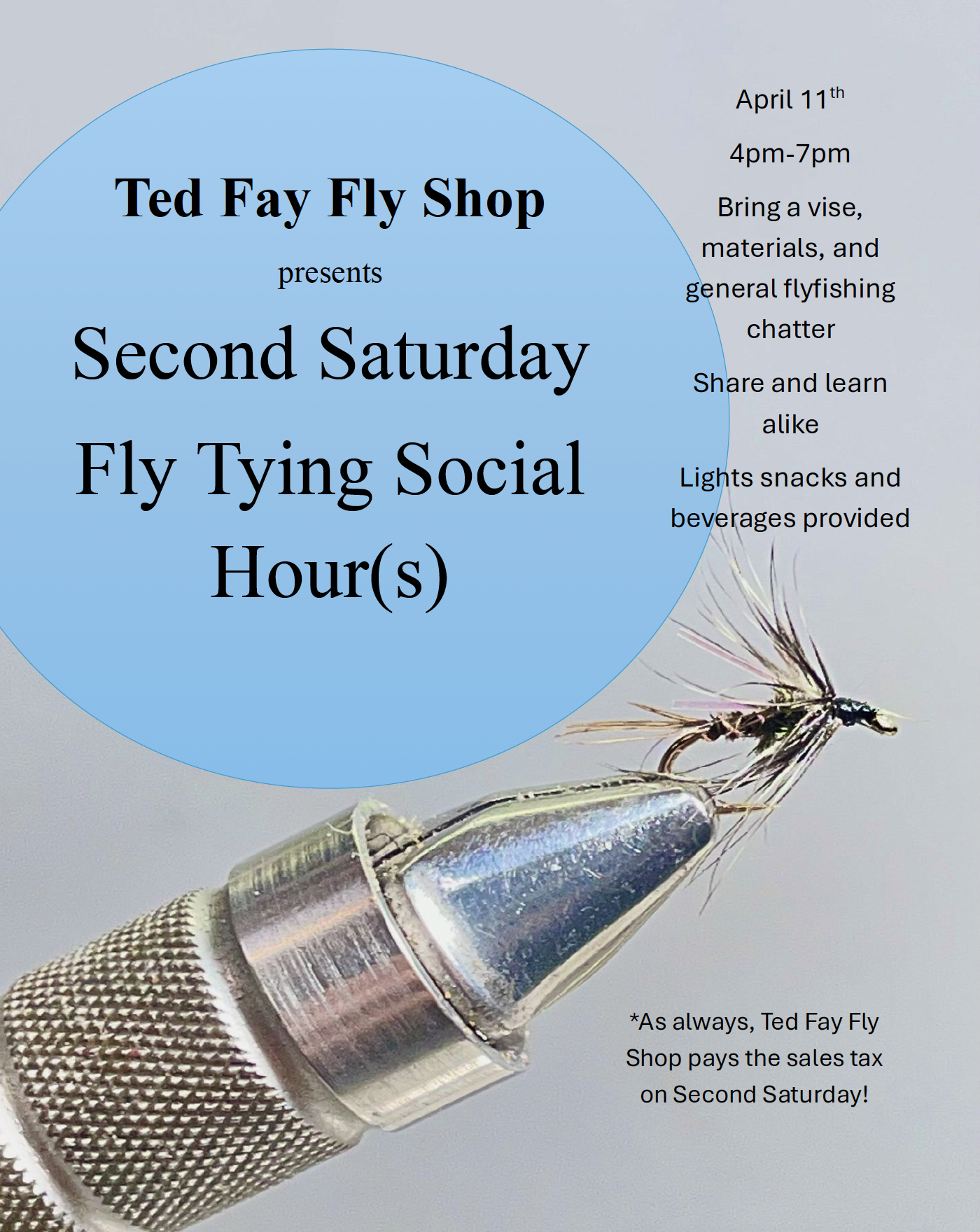 Ted Fay Fly Shop: Fly Tying Social Hour(s), 4-6pm: bring your vise, materials, and general fly-fishing chatter. Share and learn alike! Snacks & beverages provided. No sales tax on 2nd Saturdays. Open 8am-6pm.